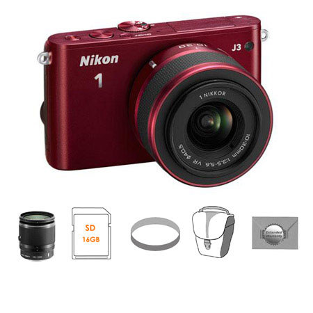 Cyber Monday Nikon 1 J3 Camera with 10-30mm VR Lens, Red - Bundle - with Nikon 10-100mm VR Black Lens, 16GB SDHC Memory Card, 40.5mm UV Filter, Mack 3 Year Extended Warranty By Nikon listed on Adorama.