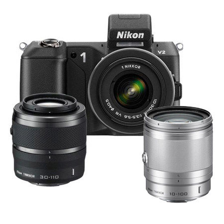 Cyber Monday Nikon 1 V2 Camera with 10-30mm VR 30-110mm VR Lens, Black - Bundle - with Nikon 10-100mm VR Silver Lens, 16GB SDHC Memory Card, 40.5mm UV Filter, Mack 3 Y By Nikon listed on Adorama.